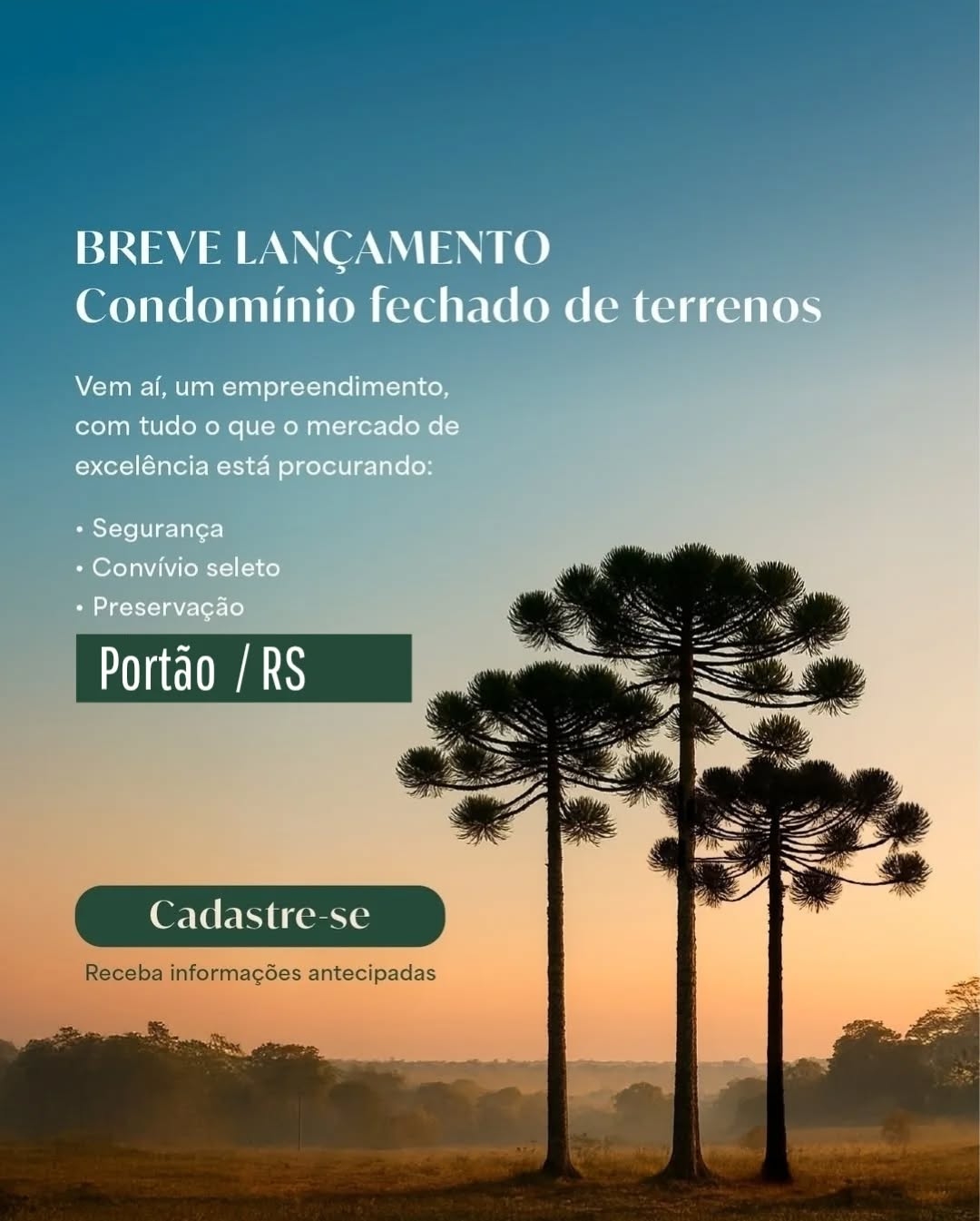 O Araucárias Ecovillage chega para trazer um novo padrão de qualidade de vida em Portão/RS. Pensado para quem valoriza segurança, privacidade e bem-estar, o empreendimento oferece terrenos em um condomínio fechado cercado por áreas verdes e a tranquilidade da natureza, sem abrir mão da praticidade do dia a dia.
